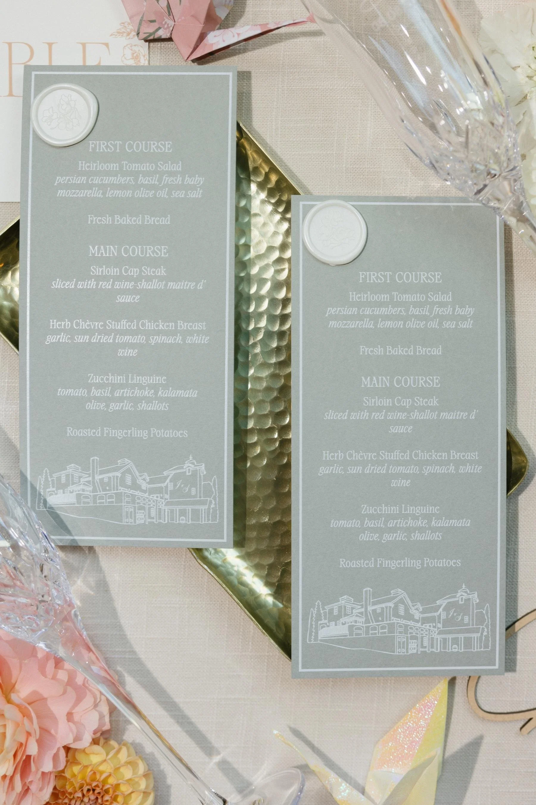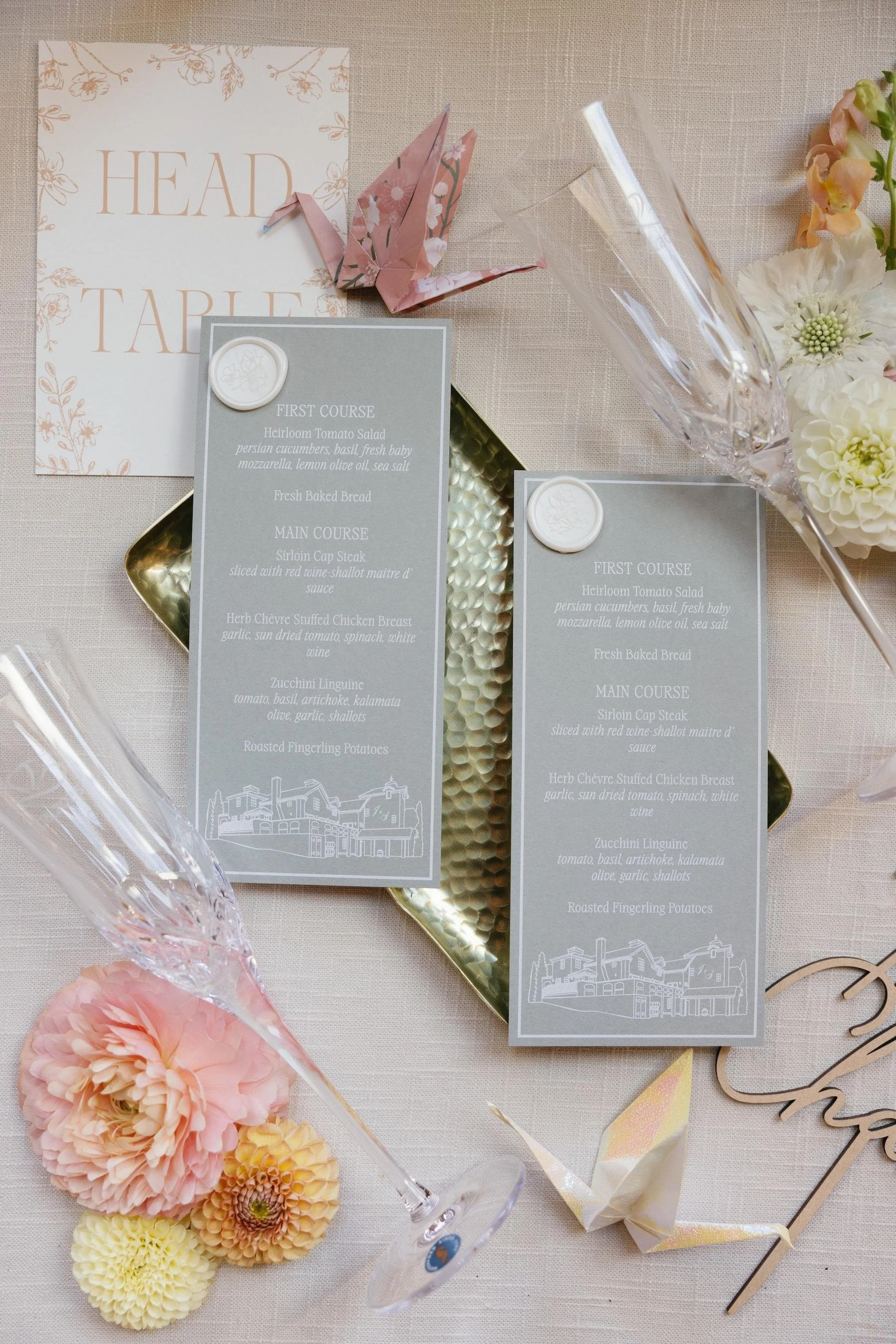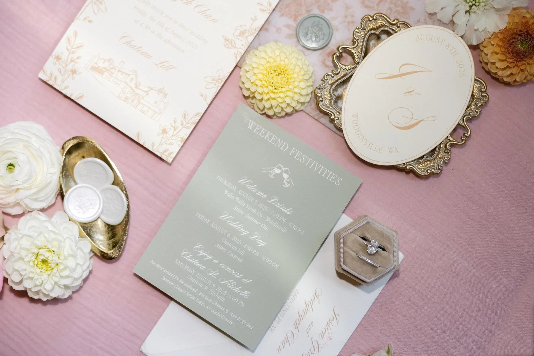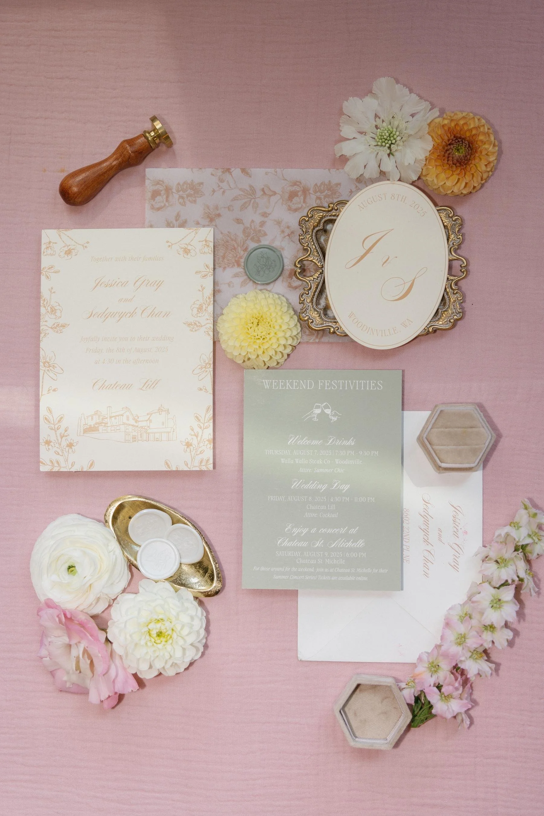 Jessica and Sedge’s wedding at Château Lill was a study in modern romance wrapped in soft, European-inspired charm. The stationery suite layered warm sage tones with peach accents — a palette that carried beautifully from the invitation suite to the day-of paper goods. From the delicate toile-inspired floral illustrations and wax seals to the elegant “I’ll save you a seat” escort display, every piece told part of a cohesive story. Gold-trimmed menus, linen bar signage, and soft blush dahlias tied the look together, creating an atmosphere that felt elevated yet deeply personal — a love letter in paper form.
