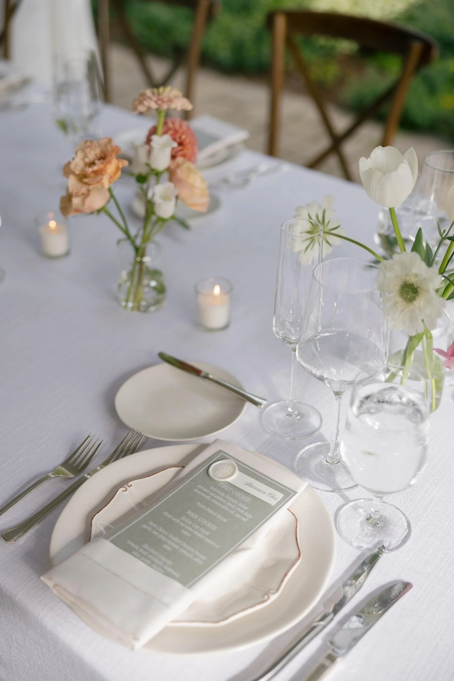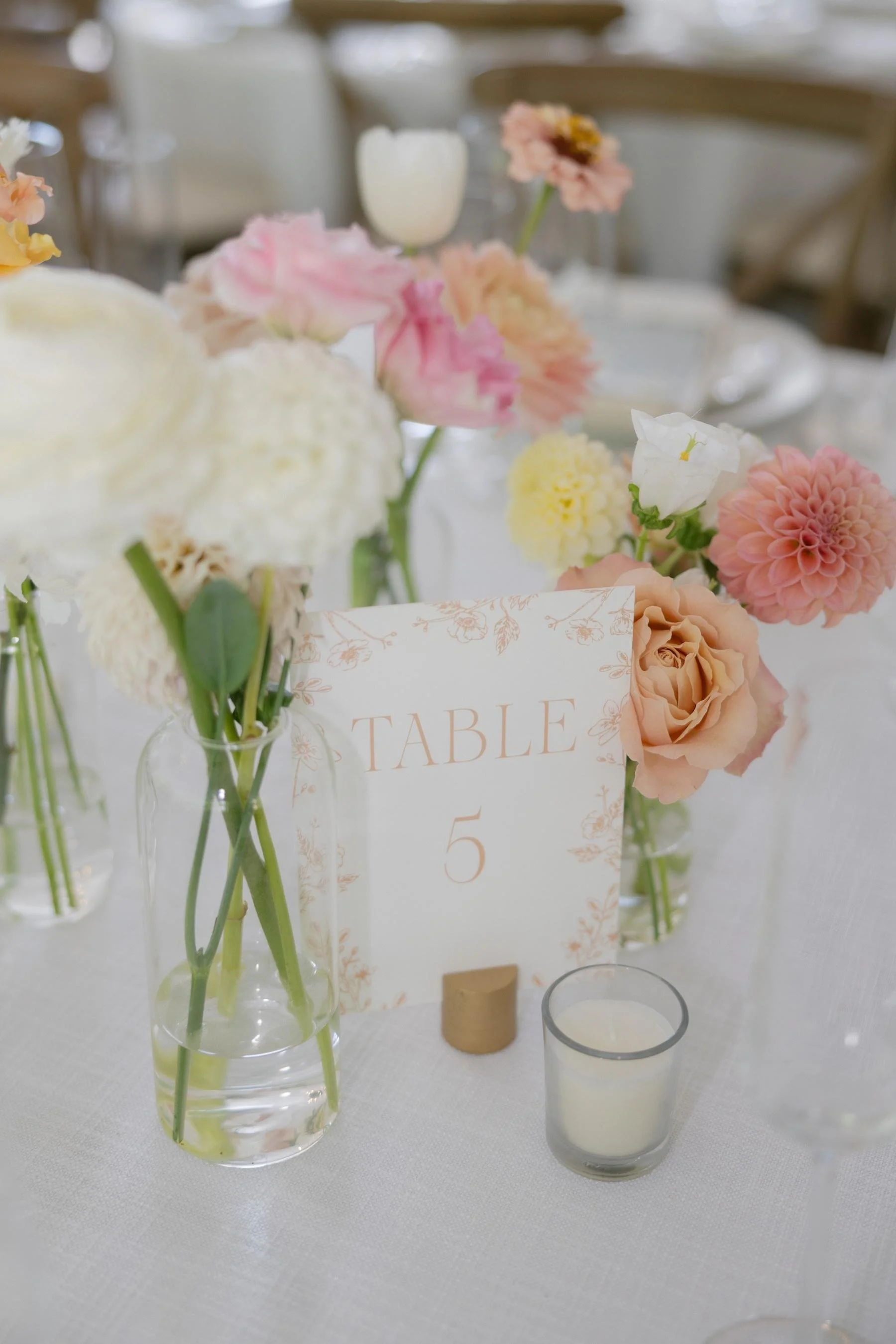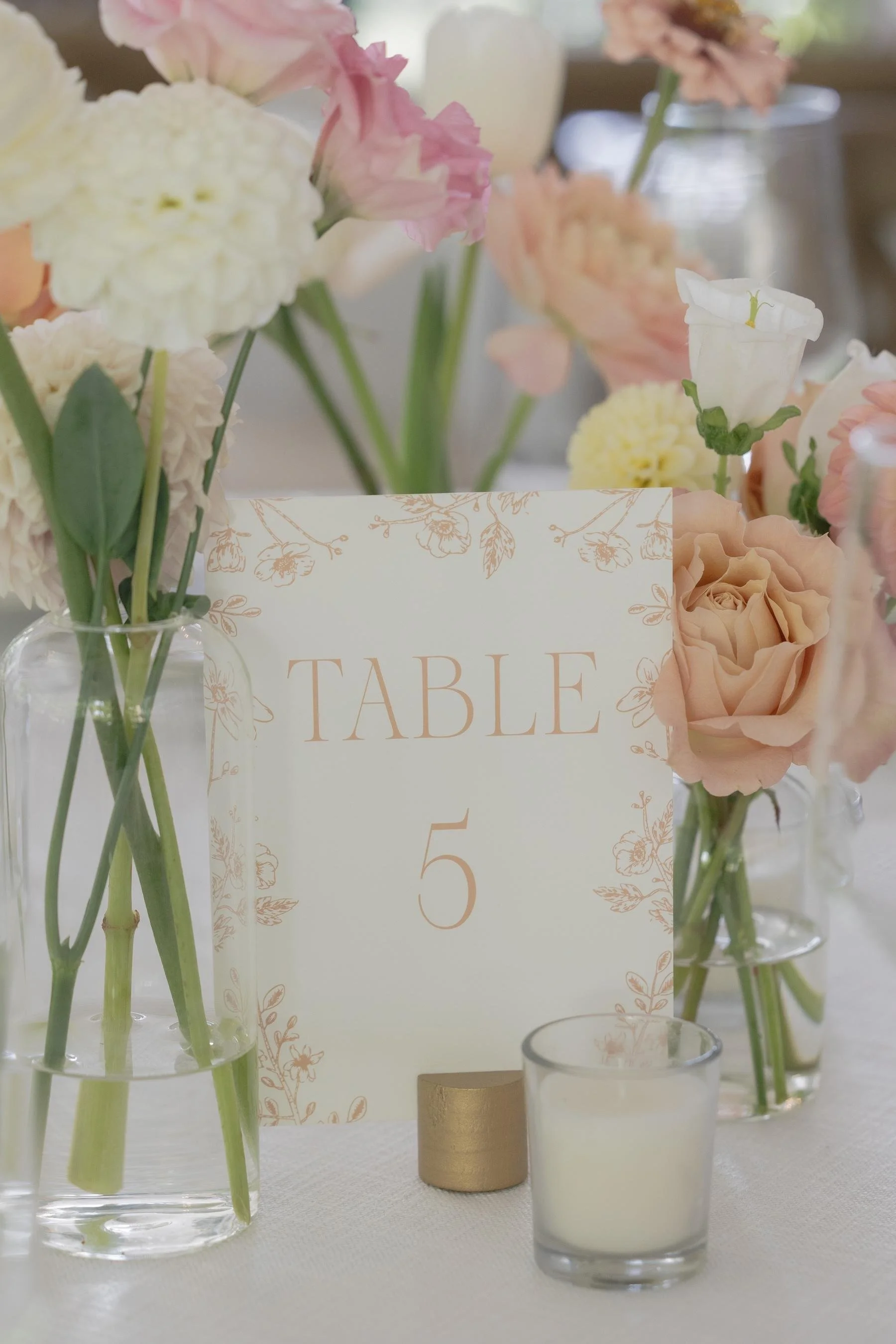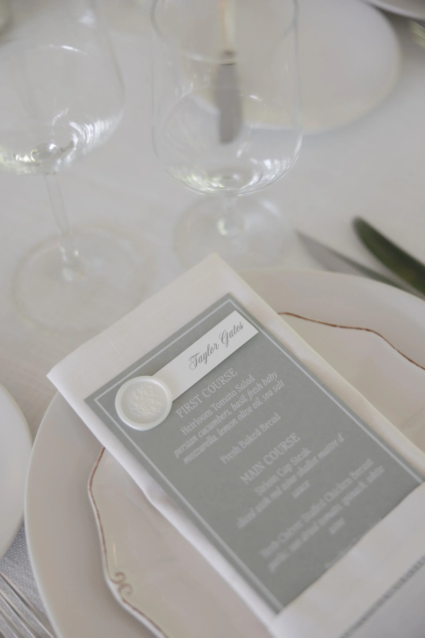 Jessica and Sedge’s wedding at Château Lill was a study in modern romance wrapped in soft, European-inspired charm. The stationery suite layered warm sage tones with peach accents — a palette that carried beautifully from the invitation suite to the day-of paper goods. From the delicate toile-inspired floral illustrations and wax seals to the elegant “I’ll save you a seat” escort display, every piece told part of a cohesive story. Gold-trimmed menus, linen bar signage, and soft blush dahlias tied the look together, creating an atmosphere that felt elevated yet deeply personal — a love letter in paper form.