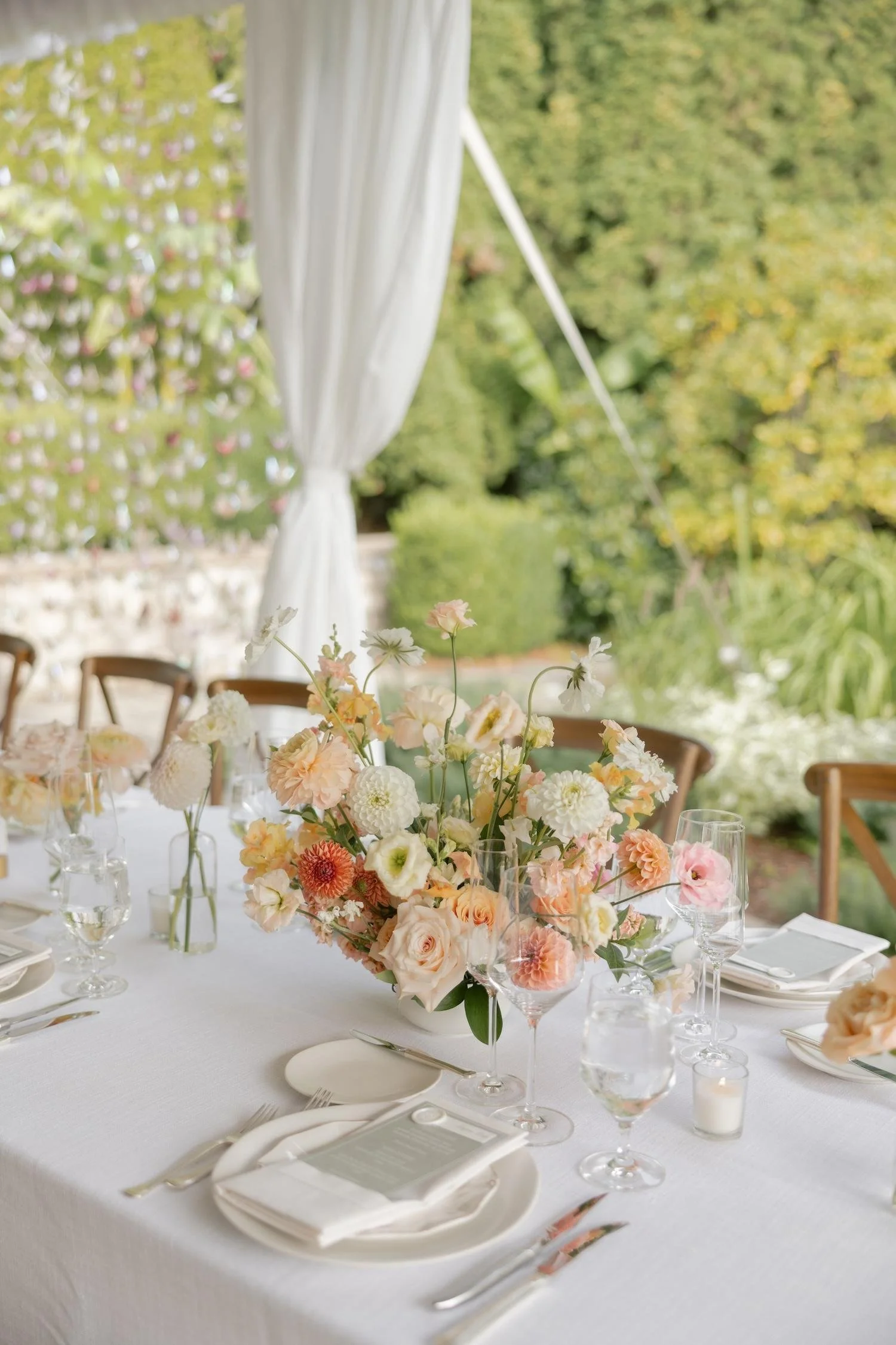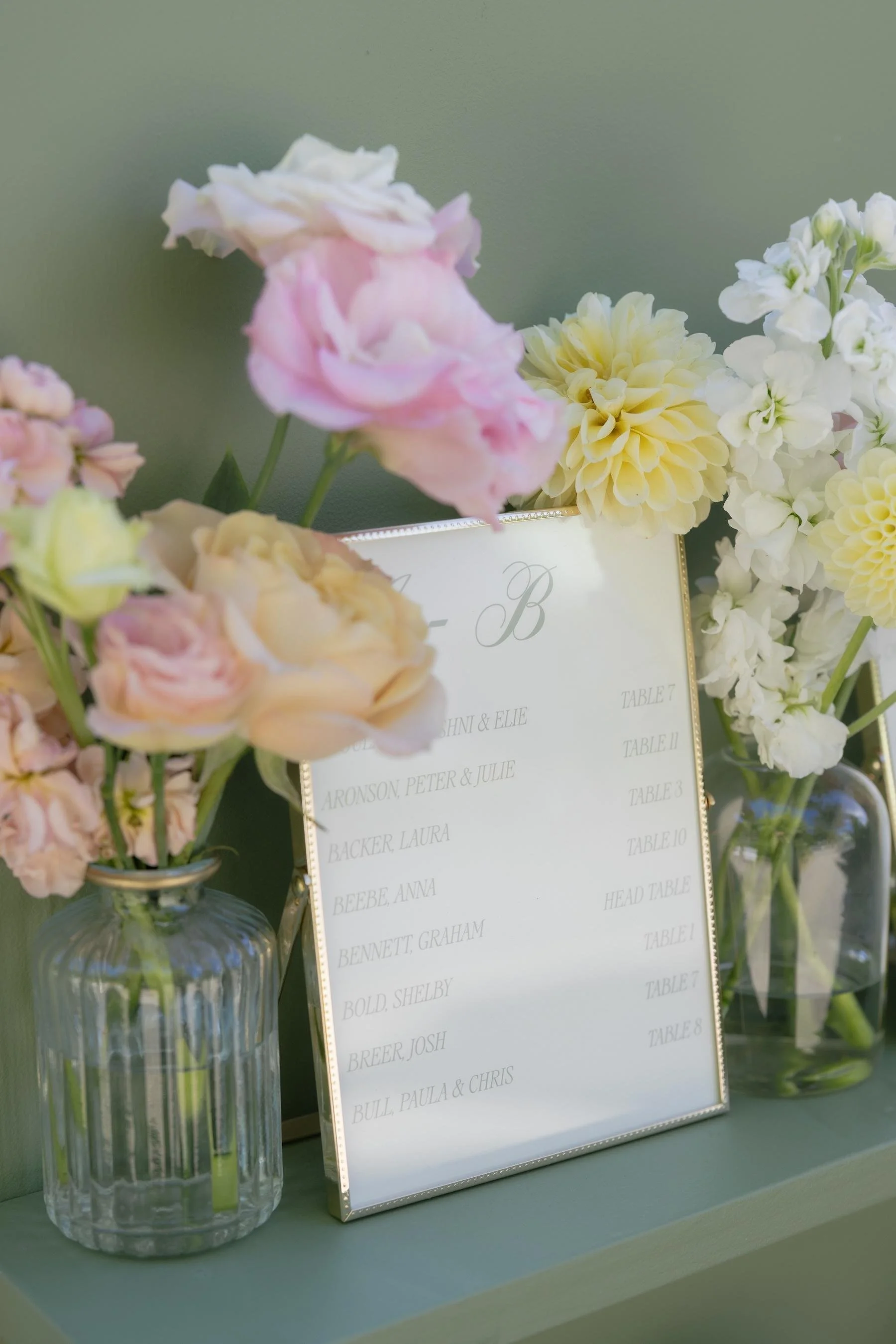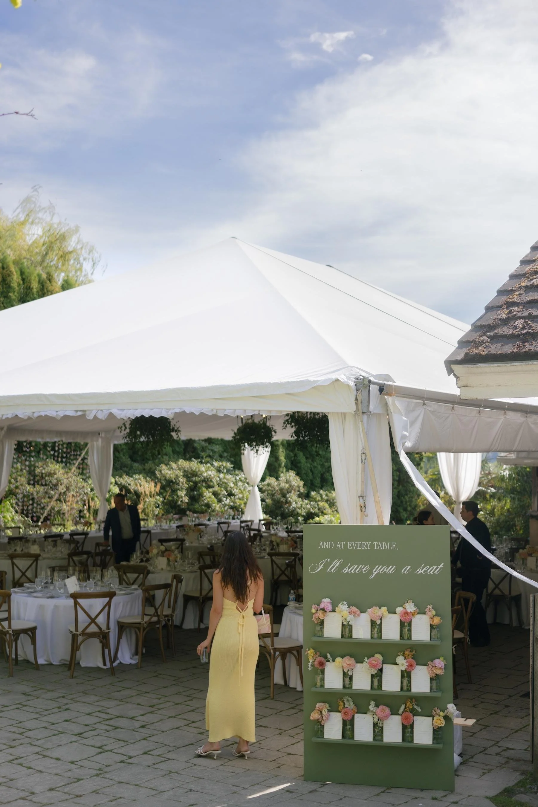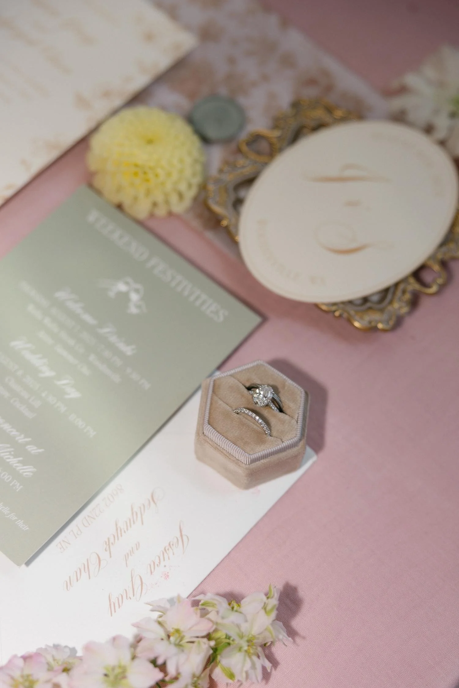 Jessica and Sedge’s wedding at Château Lill was a study in modern romance wrapped in soft, European-inspired charm. The stationery suite layered warm sage tones with peach accents — a palette that carried beautifully from the invitation suite to the day-of paper goods. From the delicate toile-inspired floral illustrations and wax seals to the elegant “I’ll save you a seat” escort display, every piece told part of a cohesive story. Gold-trimmed menus, linen bar signage, and soft blush dahlias tied the look together, creating an atmosphere that felt elevated yet deeply personal — a love letter in paper form.