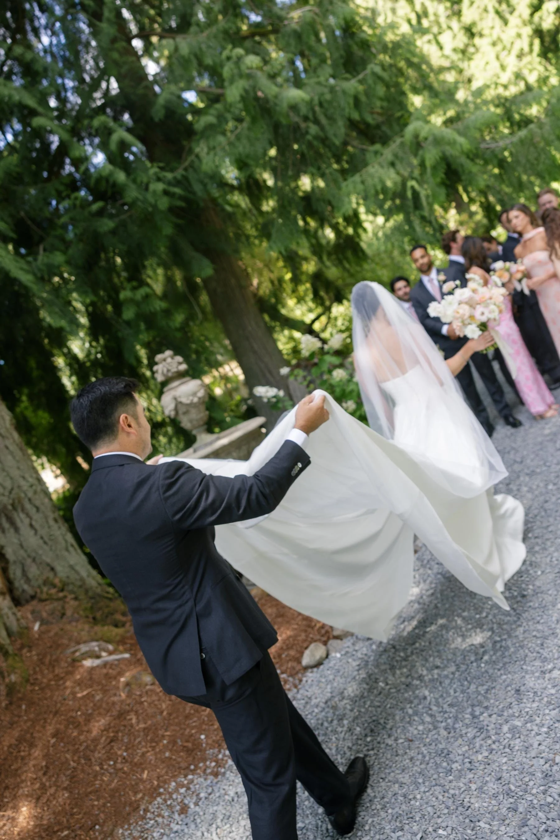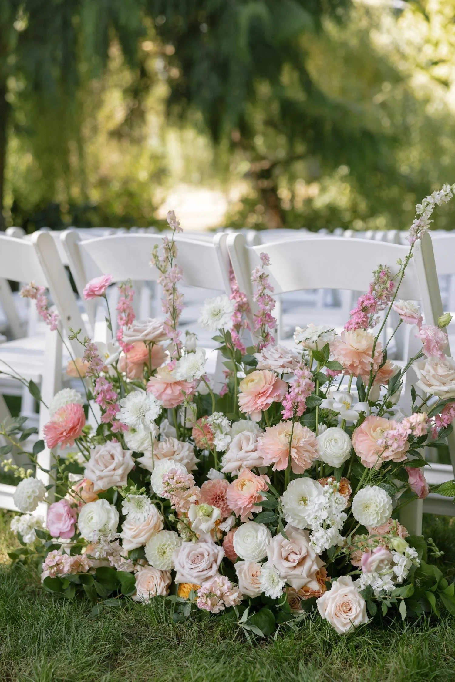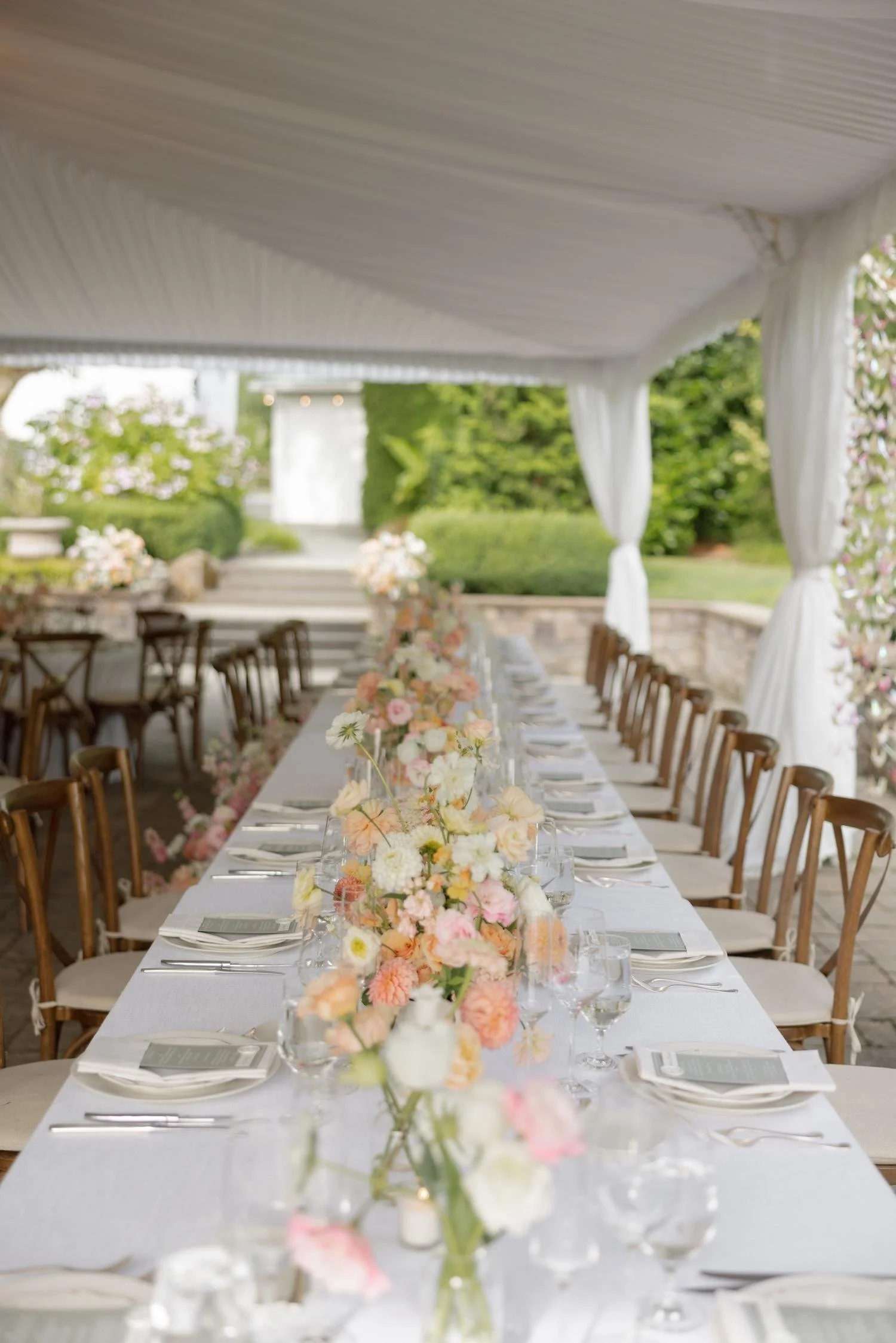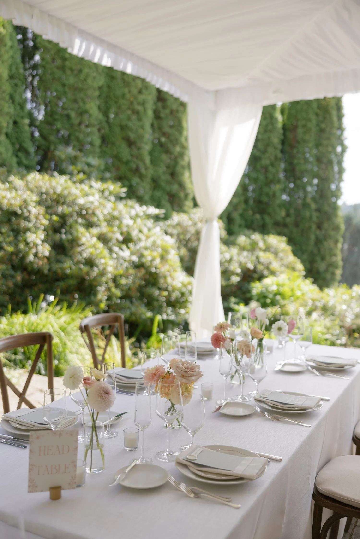 Jessica and Sedge’s wedding at Château Lill was a study in modern romance wrapped in soft, European-inspired charm. The stationery suite layered warm sage tones with peach accents — a palette that carried beautifully from the invitation suite to the day-of paper goods. From the delicate toile-inspired floral illustrations and wax seals to the elegant “I’ll save you a seat” escort display, every piece told part of a cohesive story. Gold-trimmed menus, linen bar signage, and soft blush dahlias tied the look together, creating an atmosphere that felt elevated yet deeply personal — a love letter in paper form.
