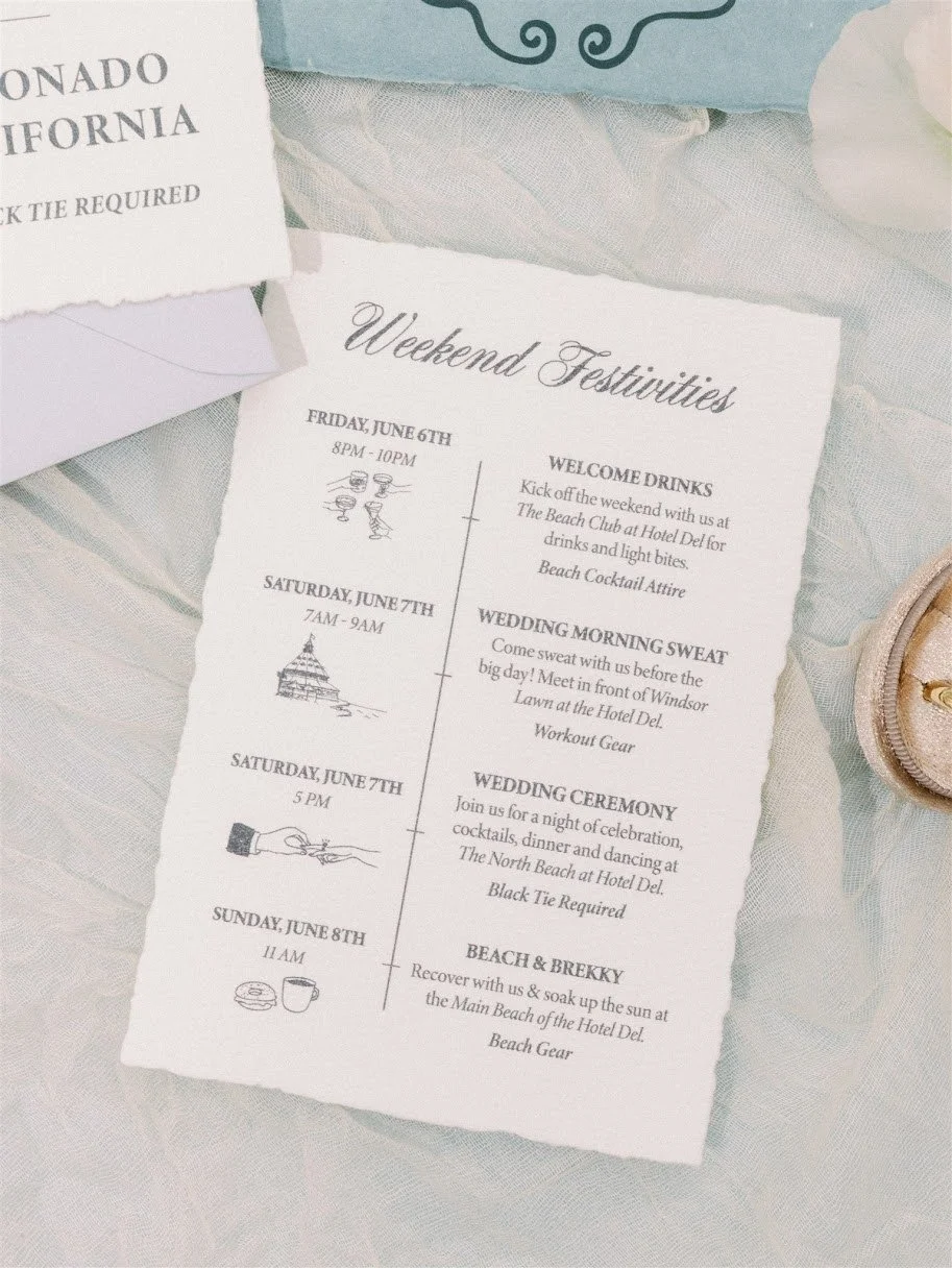 Shelby and Trevor’s seaside celebration at the iconic Hotel del Coronado was the perfect blend of California sunshine and timeless coastal elegance. Their wedding paper story featured a full custom invitation suite, rehearsal dinner invitation, weekend itinerary, day-of stationery, and signage — each piece designed to capture the refined yet relaxed spirit of their destination weekend.
